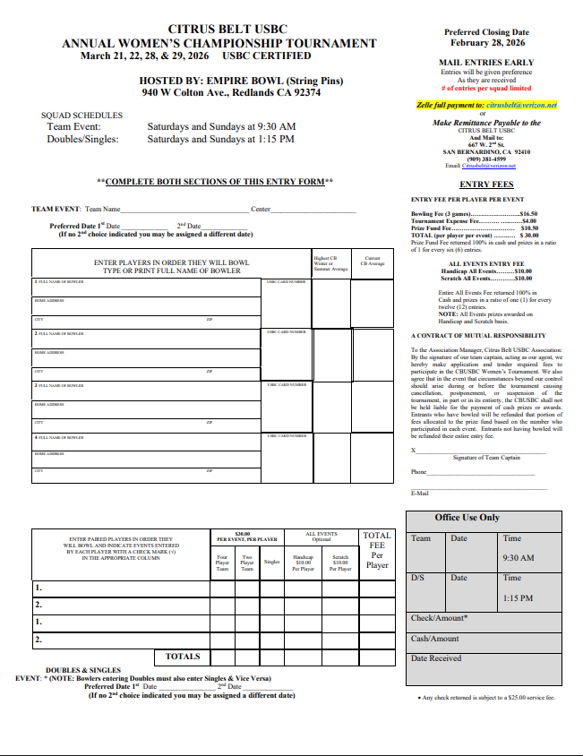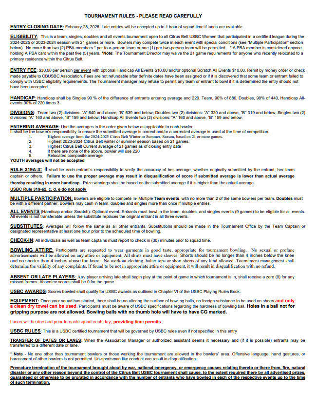 CITRUS BELT USBC ANNUAL WOMEN’S CHAMPIONSHIP TOURNAMENT